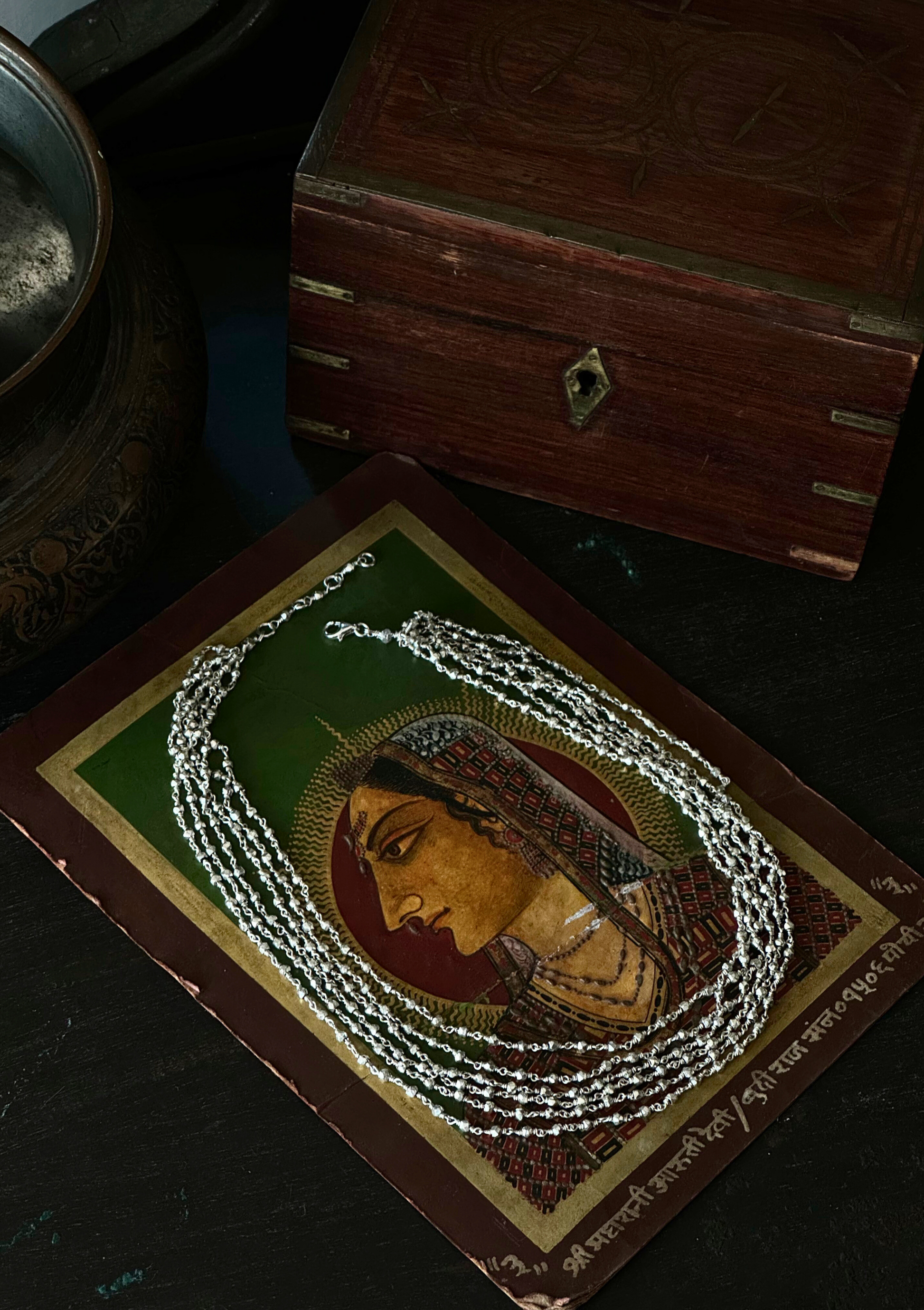 Handcrafted with faceted 92.5 silver beads. The beads flow delicately, like a river stream, with their multiple strings fitting perfectly around your neck. A true classic and timeless piece of jewellery.
