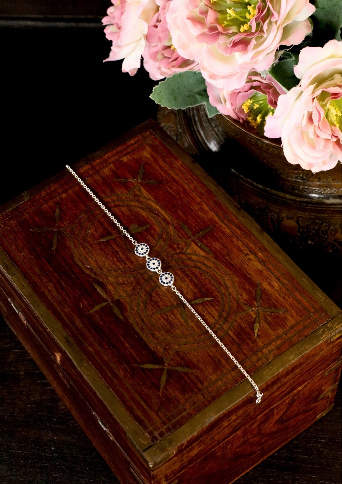 Embrace the power of protection with our Trinity Evil Eye Bracelet. Featuring three beautifully aligned evil eye motifs, this bracelet is a stylish symbol of defence against negativity. Its sleek design makes it a versatile accessory for any occasion.