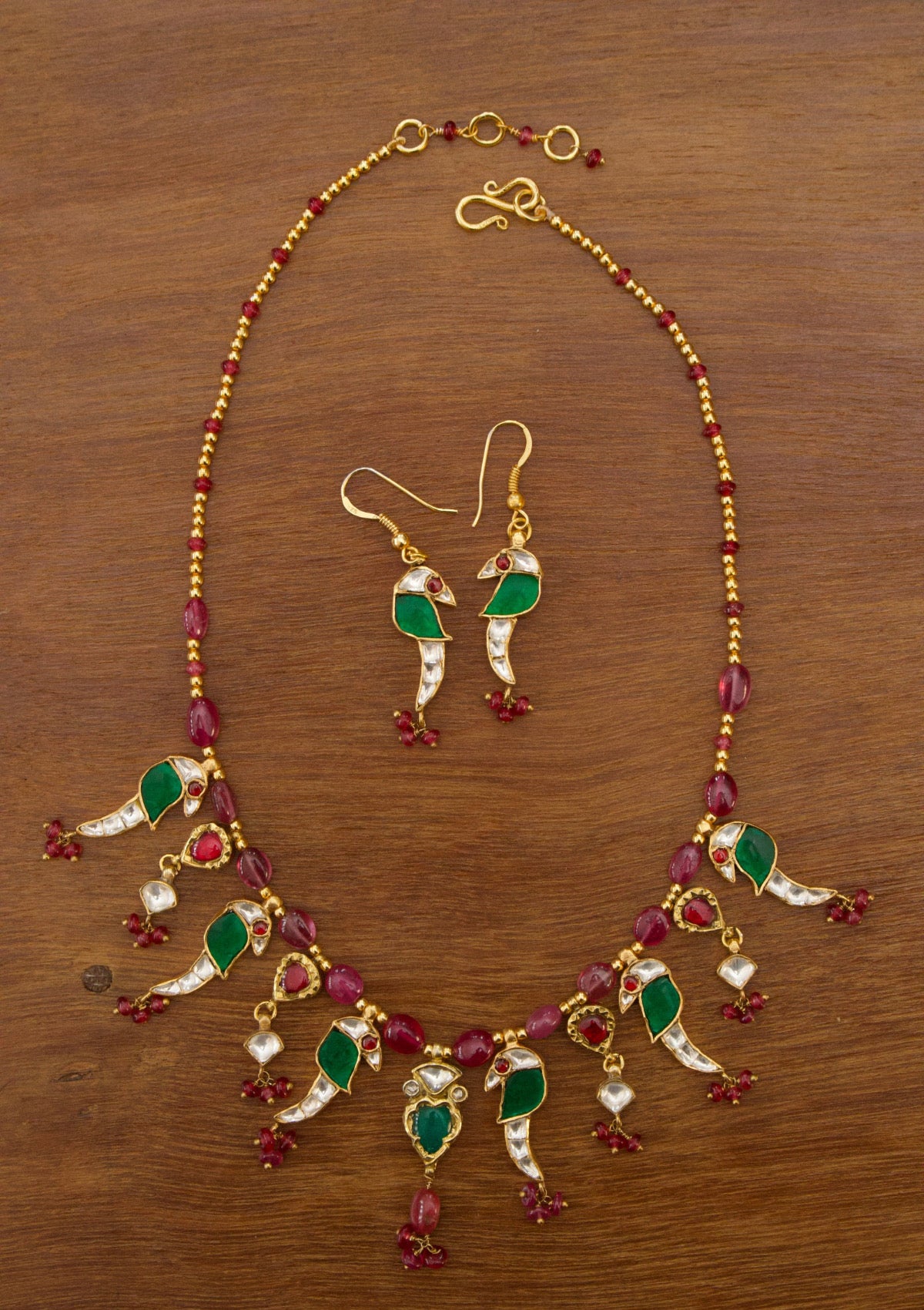This handcrafted Mithu Silver Necklace is a playful yet regal celebration of Indian motifs. Featuring six mithu (parrot) motifs with green glass stone bodies and Quartz Polki on the head and tail, each motif is alternated with leaf hangings. The necklace is beaded with gold-plated silver balls and pink glass beads, with clusters of tiny pink glass bead hangings below each mithu, creating a delicate grape-like detail. Finished in 92.5 silver with 24K gold plating, this statement piece is perfect for festive looks, mehendi functions and wedding wear.