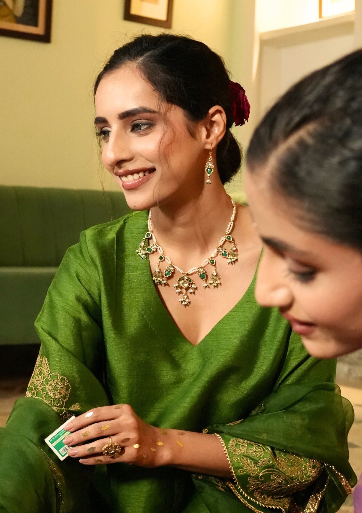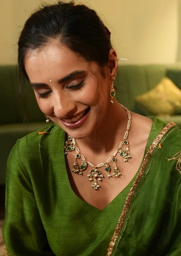 • Composition: 92.5 Silver with 24K Gold Plating, Quartz Polki, Green Glass Stones & Freshwater Pearls
