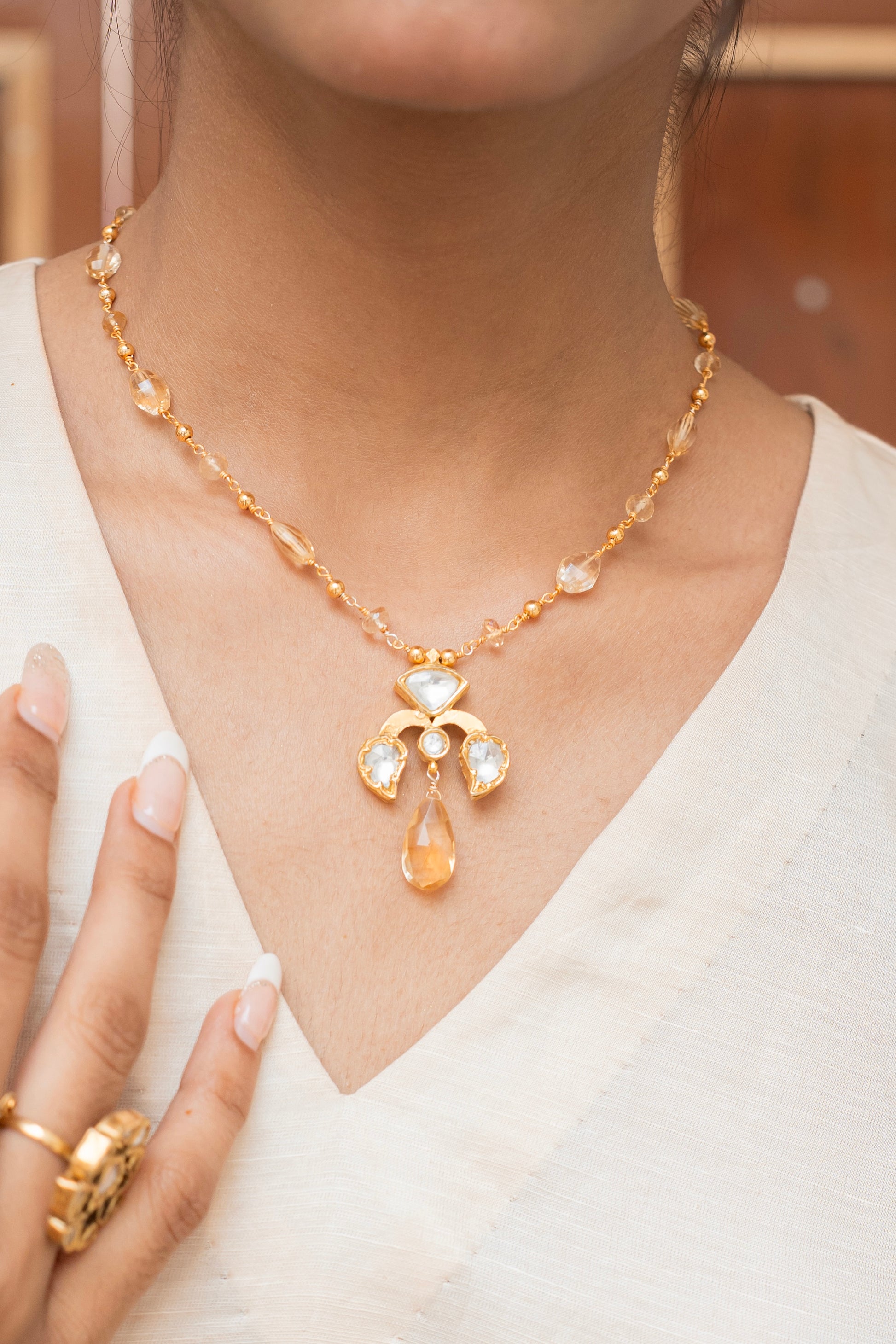 This handcrafted Sagar Silver Pendant Necklace evokes the warmth of a sunset glistening over the ocean. The pendant is adorned with 45 carats of natural faceted Citrine, radiating a golden glow that mirrors the sea at dusk. At its center lies a stunning setting of Quartz Polki, crowned with a delicate drop of Citrine that adds movement and brilliance. Finished in 92.5 silver with 24K gold plating, it is a breathtaking statement piece — luminous, elegant, and timeless.